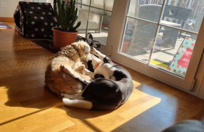 Hash musste am 14. August 2025 leider wieder auf seine frühere Pflegestelle umziehen. In seinem vorübergehenden Zuhause war es für ihn in der Wohnung ein zu starkes Kommen und Gehen von Besuchern. Er hat begonnen, die Personen zu stellen. Der Versuch, ihn in eine Box zu schicken, wenn fremde Leute zur Tür hereinkamen, gelang nicht vollständig. Vielleicht auch wegen der Beschaffenheit der Box. Für sein neues Zuhause wünschen wir uns deshalb einen ruhigen Haushalt ohne viel Kommen und Gehen von Fremden, in dem ihm ebenfalls eine Gitterbox angeboten wird. Auch die Wohnsituation in der Stadt war für Hash nicht passend. So konnte er nie richtig zur Ruhe kommen.