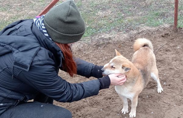 Shiba ist eine sehr liebe, menschenbezogene und kinderfreundliche Hündin. Die Mentoren versuchen sie zu verwöhnen und zu streicheln, worüber sie sich sehr freut und sie sucht jetzt auch schon aus eigenem Antrieb unsere Nähe. Wir versuchen, das berühmte „Shiba-Lächeln“ auf ihrem kleinen Gesicht hervor zu zaubern. Sie lebt mit mehreren Hunden zusammen, zeigt eine eher unterwürfige Haltung und beteiligt sich an keiner Auseinandersetzung. Sie kann an der Leine geführt werden.