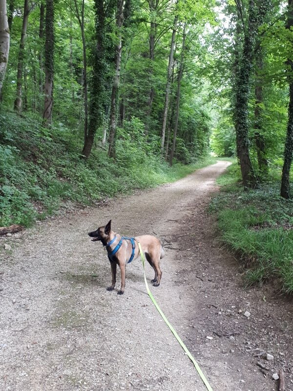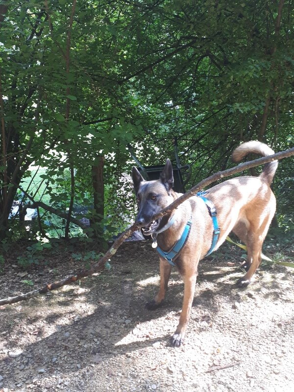 Wie wir durch die Videos von Raja bereits erahnen konnten, ist Raja ein sehr submassiver und unsicherer Hund. In Situationen mit vielen Einflüssen (stark befahrener Strasse mit Tram und Menschen) zeigte sie sehr starkes Meideverhalten - sie wollte am liebsten wegrennen, machte sich klein und schaut hektisch herum. In gewissen Situation kamen aber auch die -w wohl rassentypischen - Merkmale (Malinois = Fight) zum Vorschein. Ab dem vierten Tag hat sie angefangen in gewissen Situationen (z.B. bei Vorbeifahrt eines Trottinets oder bei Menschen, die sich "komisch" verhielten etc.) zu bellen und nach vorne zu gehen um die Menschen zu vertreiben. Auch zu Hause hat sie einen starken Verteidigungsdrang entwickelt und jedes Mal , wenn jemand an der Wohnungstür vorbeilief, oder zu Besuch gekommen ist, gebellt. Mit Hilfe von Gegenkonditionierung und durch das Abnehmen der Verantwortung ist dies über die Zeit immer besser geworden. Doch auch heute gibt es immer noch wenige Situationen, wo Raja aus der Haut fährt. Wir vermutet, dass diese Situationen mit schlechten Erfahrungen aus Ungarn zusammenhängen. Wir sind etwa acht Monate, nachdem Raja zu uns gekommen ist, aus der Stadt weggezogen, in einer ruhigeren Wohnung mit Garten und in Waldnähe. das hat die Situation für uns alle entspannt, da die Umgebung nun viel reizarmer ist und Raja nun mehr zur Ruhe kommt. Auch gerade hinsichtlich der Hitze im Sommer, unter der Raja sehr leidet, war der Umzug von Vorteil, da es am neuen Ort nachts viel besser abkühlt und es bei den Spaziergängen im Wald viel kühler ist. Zudem hat sie hier einige gute Hundefreunde gefunden, mit denen sie regelmäßig spielen kann.