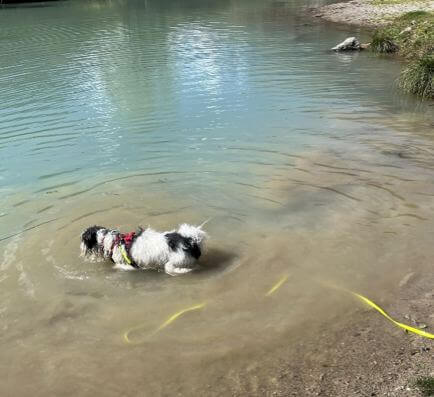 Im Sommer waren wir im Engadin, wo sie über mehrere Wochen frei über die Wiesen ihre sehr starke Lebensfreude, Kraft und Temperament ausleben konnte. Dort hat sie auch das Wasser kennen gelernt und ist dermassen davon begeistert, dass ich sie anleinen muss, um an gefährlichen Bach- und Flussstellen vorbeizukommen.