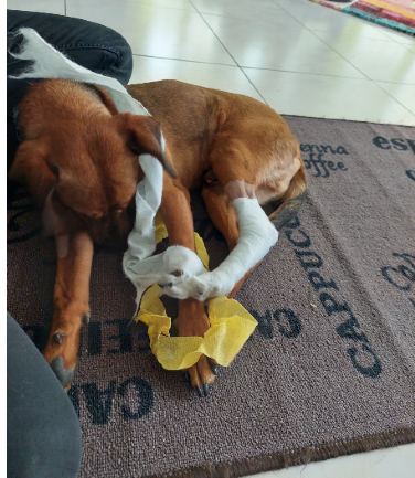 Kurze Zeit nach der Herzwurmbehandlung hat sich Sparrows Bein entzündet (dort, wo er vor unserer Zeit eine OP hatte) und er musste operiert werden. Aber er hat auch das gut mitgemacht und sich schnell erholt.
