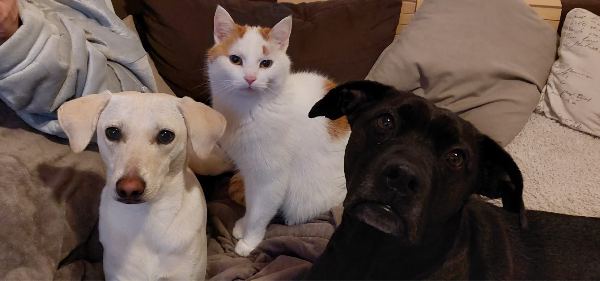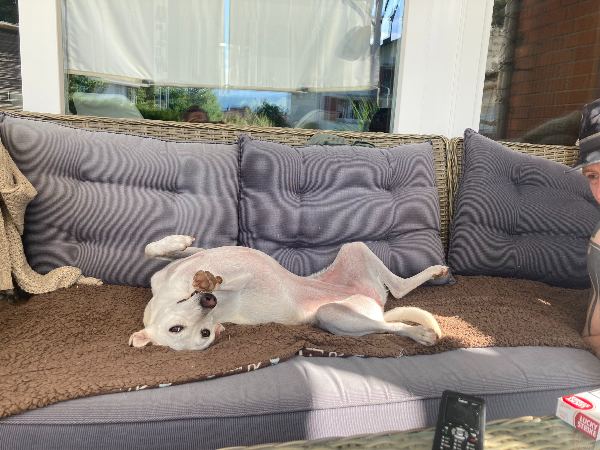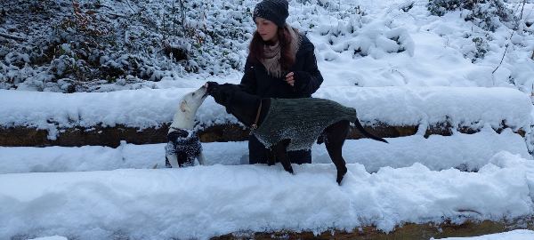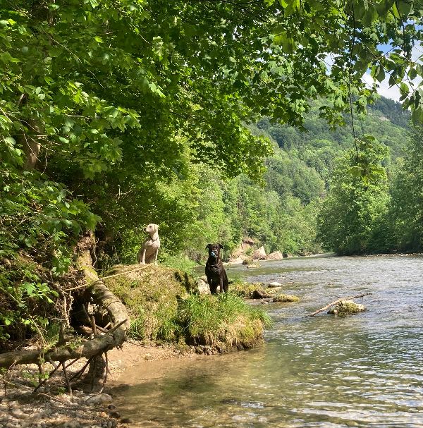 Sie war sehr ängstlich und verunsichert. Alles war für sie neu! Anfangs knurrte sie sogar ihren jetztigen besten Kumpel und Sicherheitsanker Floo (der grosse Schwarze) an. Inzwischen könnten die beiden nicht mehr ohne einander ♥️! Jeden Abend wird im Garten ausgiebig gespielt, bis Floo nicht mehr kann…, dann wird mit der Katze (Jackson 11 Jährig) um die Büsche Fangis gespielt, abwechseld!! Zwei bis drei mal täglich gehen wir laufen. Der Rückruf funktioniert super, ausser wenn Kinder, Velos oder unbekanntes auf uns zukommt, daran arbeiten wir! Sie würde jedoch nie zu weit weg gehen, dafür ist sie zu stark auf unser Rudel fixiert.