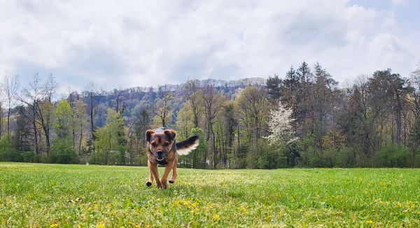Der Rückruf klappt extrem gut, daher darf Léon auch viel frei sein. Das geniesst er auch, denn Rennen ist eine weitere Leidenschaft von ihm. Er ist bei allem mit voller Begeisterung dabei, sei es bei Militarys, Futterbeuteltraining, Trailen,...