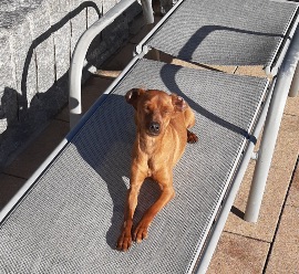 Die Moma, so nennen die Grosskinder sie, musste bei mir nach etlichen Arztbesuchen die Nahrung umstellen, da ich immer Blut im Kot hatte. Jetz ist alles in bester Ordnung und ich gedeihe so richtig. Am wohlsten fühle ich mich bei schönem Wetter und Sonnenschein. Ich liege dann stundenlang an der prallen Sonne auf Momas Liegestuhl. Das Regenwetter hasse ich fürchterlich, sodass ich meine Geschäfte nicht immer dort mache, wo mein treues Frauchen es wünscht. Aber sonst hat sie und auch der Papa grosse Freude an mir. Ich fühle mich pudelwohl in meiner neuen Umgebung.
