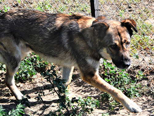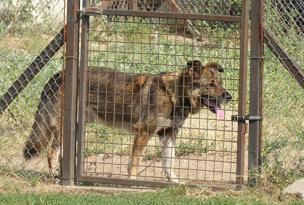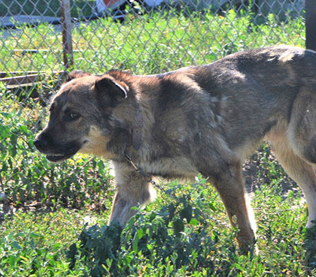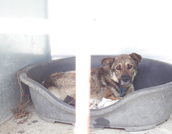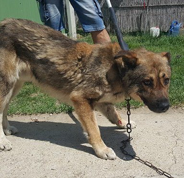 Der traurige Félix hatte bisher kein schönes Leben. Er wurde herrenlos aufgefunden und ins Tierheim gebracht. Wie man sieht, hing die Kette noch an seinem Halsband, befestigt mit einem Draht. Félix hatte wohl grosse Schmerzen und liess niemanden an sich heran, um das Halsband zu entfernen.