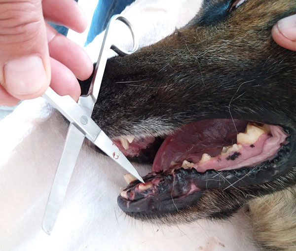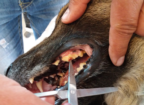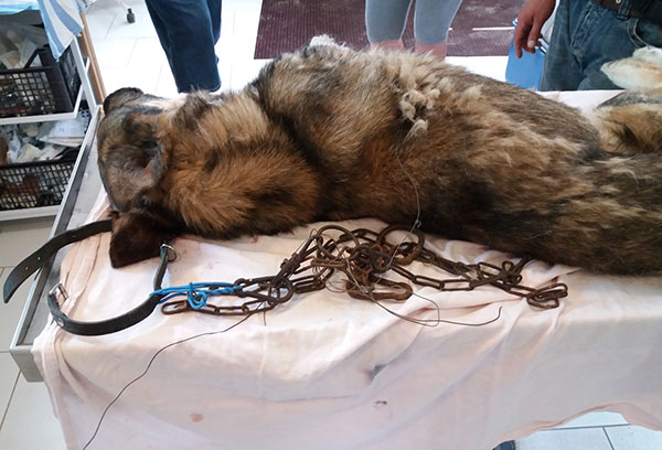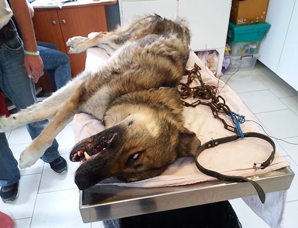 Félix bekam eine Betäubung und das Halsband konnte entfernt werden. Einige Zähne sind gebrochen. Wahrscheinlich versuchte er, die Kette loszuwerden.