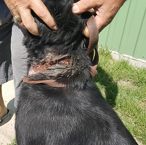 Diese Hündin wurde herrenlos augefunden und ins Tierheim gebracht. Die arme kleine Vierbeinerin hat eine riesige Wunde am Hals. Sie wird nun medizinisch versorgt und kann sich erholen...
