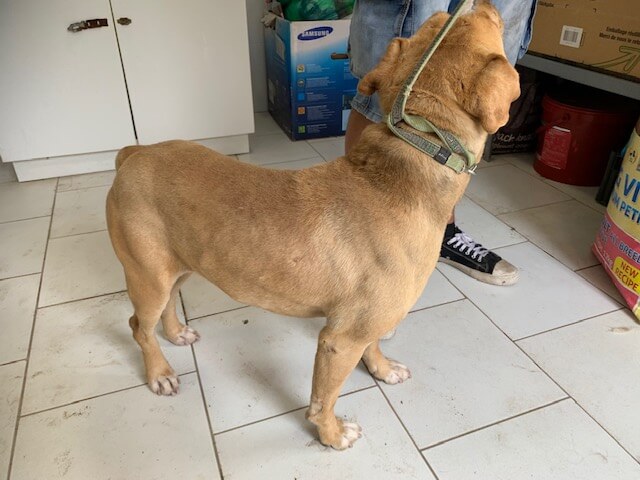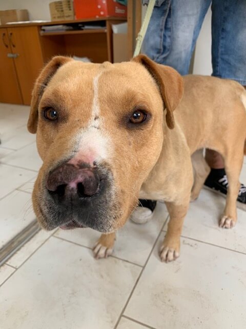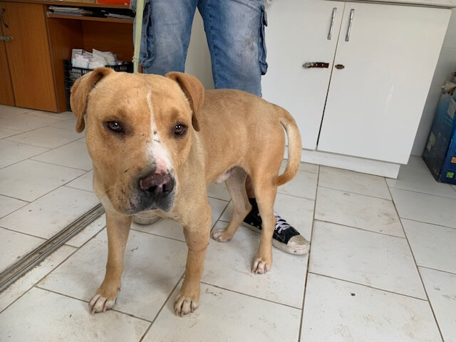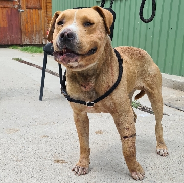 Dieser verletzte Staff wurde heute von einer Familie in deren Garten gefunden. Er hat diverse Wunden am Körper und kann kaum aufstehen, da sein linkes Bein gebrochen ist. Zu allem Übel hatte er auch noch ein viel zu enges Halsband an.