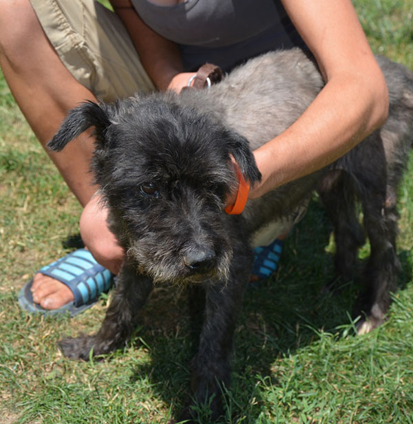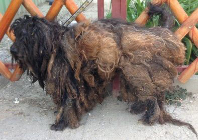 Papoka wurde in Ungan total verfilzt und verwahrlost aufgefunden und ins Tierheim gebracht. An seinem Hals hing noch eine Kette.