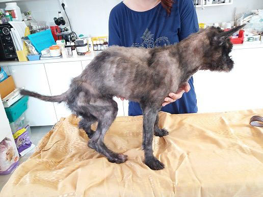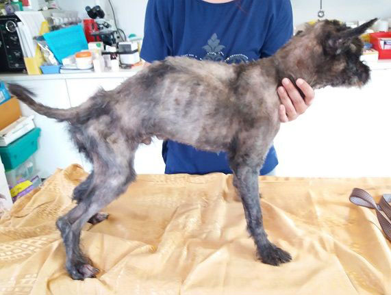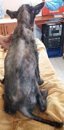 Mittlerweile wurde Papoka geschoren und ein brandmagerer Hund kam zum Vorschein. Als man Papoka fand wog er 8kg, dann nach dem Scheren 6kg und mittlerweile 9kg, aber er muss noch weiter zunehmen.