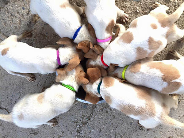 Sie haben gierig den mit Welpenmilchpulver + Trockenfutter gemachten Brei verschlungen und sind dann in Tiefschlaf gefallen. Wie klein sie sind sieht man im Grössenvergleich mit der 1,5 l PET-Flasche.