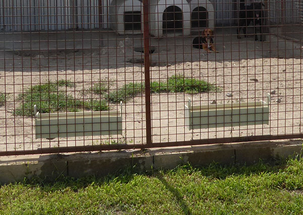 Auf der letzten Reise im Mai wurde das unbefriedigende Tränkesystem besprochen. (Wir berichteten) Umgehend wurde die Idee des "Balkon-Blumenkasten-Symstem“ umgesetzt. Es bewährt sich hervorragend. Da die Tränken nicht mehr auf dem Boden stehen sondern am Gitter befestigt sind, macht sich Nathalie Sorgen um die kleinen Welpen, für die der Zugang zum Wasser nun wohl etwas schwieriger ist. Kaum gesagt zeigt ihr ein Winzling wie es geht: Behende klettert er die wenigen cm das Gitter hinauf und lässt sich dann ins Wasser plumpsen. So geht das!